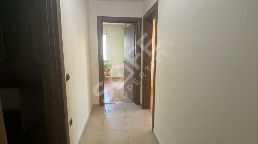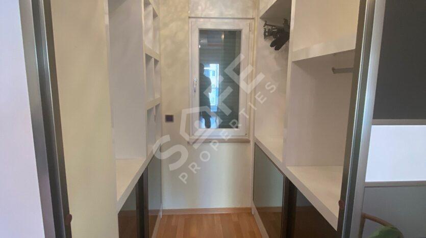 The apartment features a separate kitchen equipped with a modern built-in appliance set, two balconies, and a dressing room. Enjoy the comfort of central heating with natural gas, electric blinds for added privacy, and a luxurious en-suite bathroom in the primary bedroom.