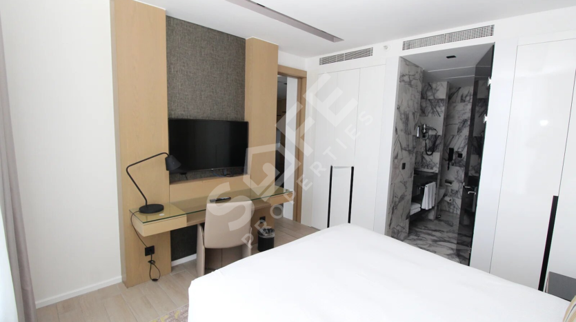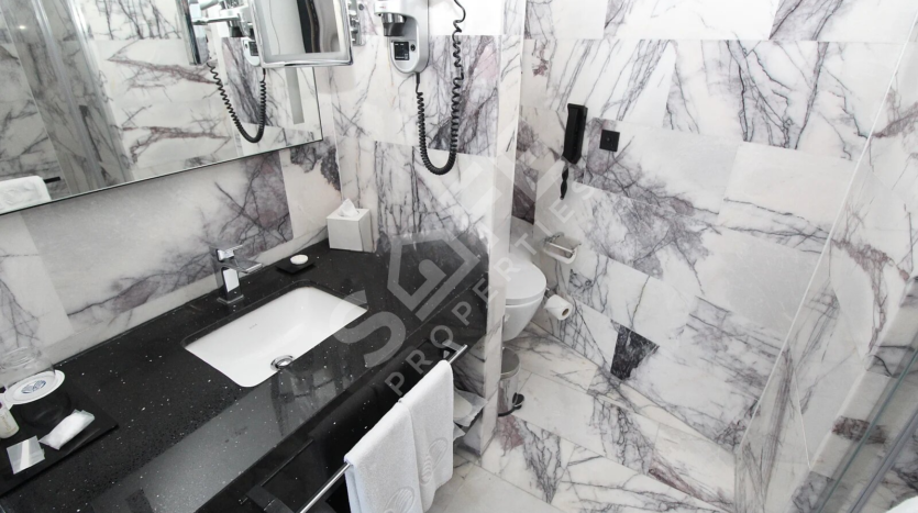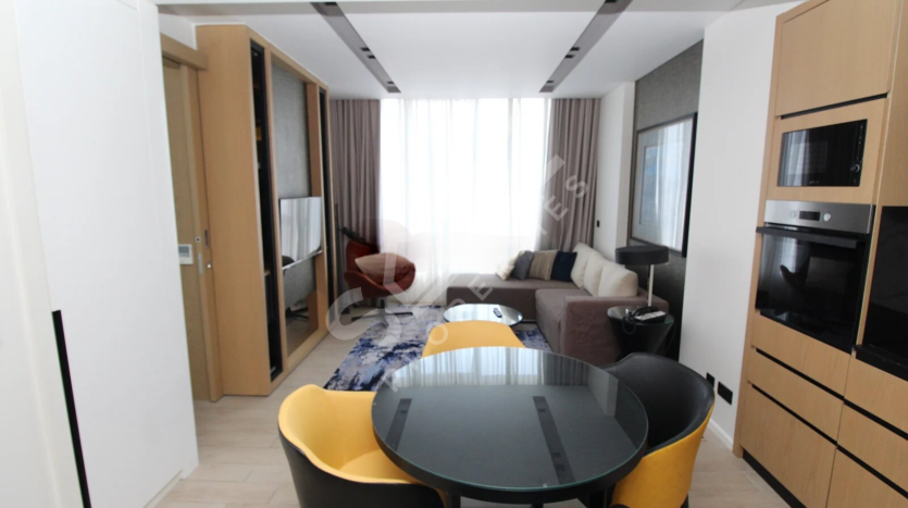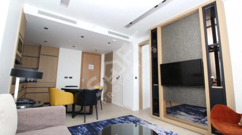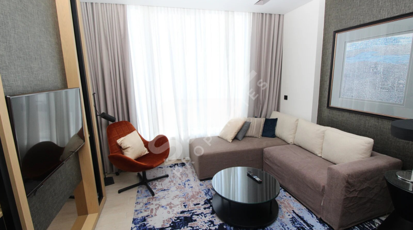 The 1-bedroom apartments for sale are located in G Rotana Hotel, built on a 1,800 m² land. The hotel offers amenities such as CCTV surveillance, a reception area, lobby services, a meeting room, a fitness center, a Turkish bath, a steam room, an outdoor cinema, billiard tables, table tennis, a game room, a terrace with a cafe, a restaurant, a library, a generator, indoor parking, a spa, a pergola, and a panoramic elevator.